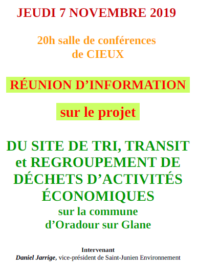 Fortement sollicitée par des riverains, l’association Saint-Junien Environnement organise une réunion d’information sur le projet d’installation par la société Chimirec-Delvert d’un site de tri, transit et regroupement de déchets d’activités économiques sur la commune d’Oradour-sur-Glane.